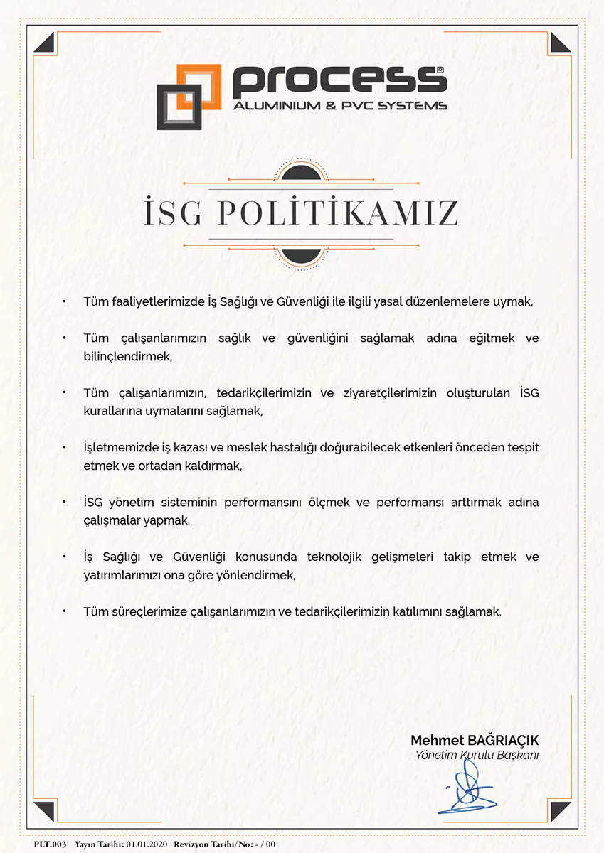 Kalite konusunda uzman kadrosu ile hizmet veren Process Plise sizin memnuniyetinizi bir numara olarak hedef alıp isteklerinize tam karşılık vermeyi kendisine misyon edinmiş bir şekilde sizlere hizmet sunmaktadır.Kalite bilincini başta yöneticileri olmak üzere en alt kademeye kadar tüm çalışanlarına aşılayan, detaylara önem veren, hızlı, temiz ve sorunsuz bir teslimat aşaması sunan firmamızla müşteri değerlerini ön plana çıkarıyoruz.
